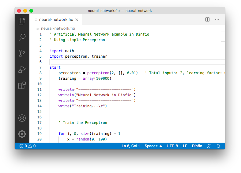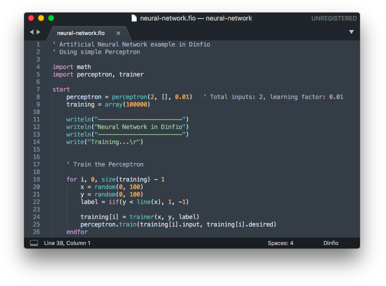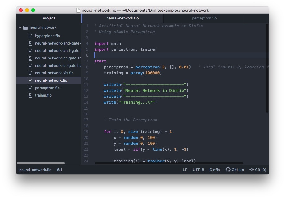Dinfio supports multiple paradigms, including imperative, procedural, object-oriented, and event-driven programming. Dinfio comes with great built-in modules, like Standard I/O, String manipulation functions, Mathematical functions, Date and Time, Regular expression, File I/O, Graphical User Interface (GUI), HTTP requests, JSON functions, and more.